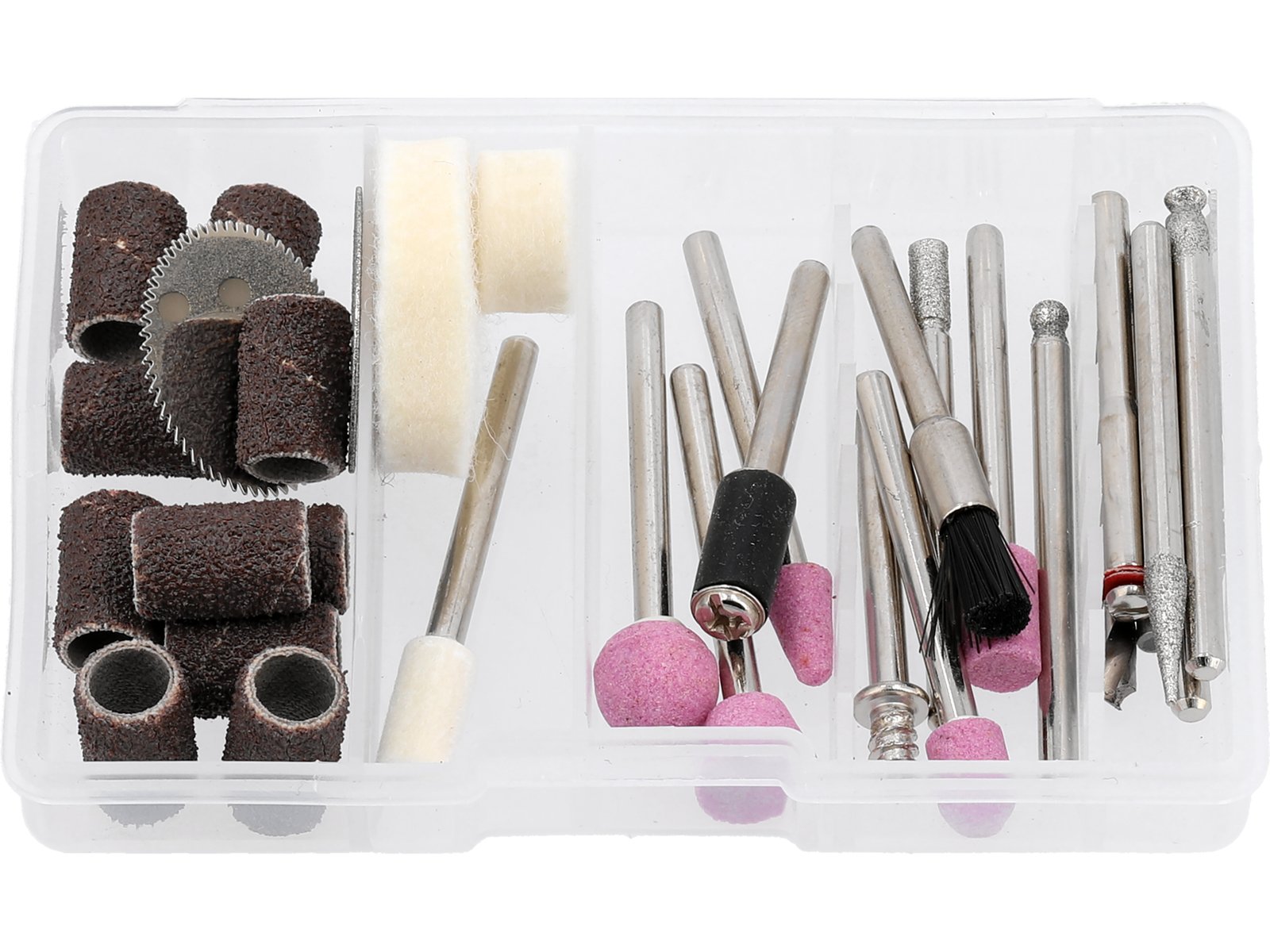 - Conținutul setului cont.: știft pentru roți de pâslă|dorn de măcinat|șmirghel x10|pânză de ferăstrău x2|freza|pâslă x2|perie