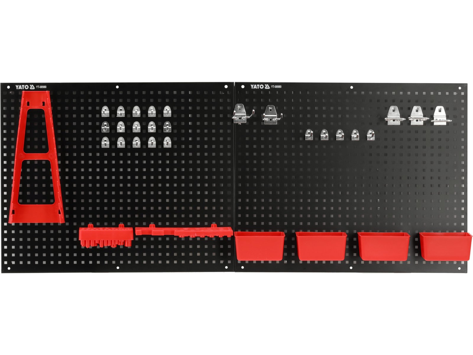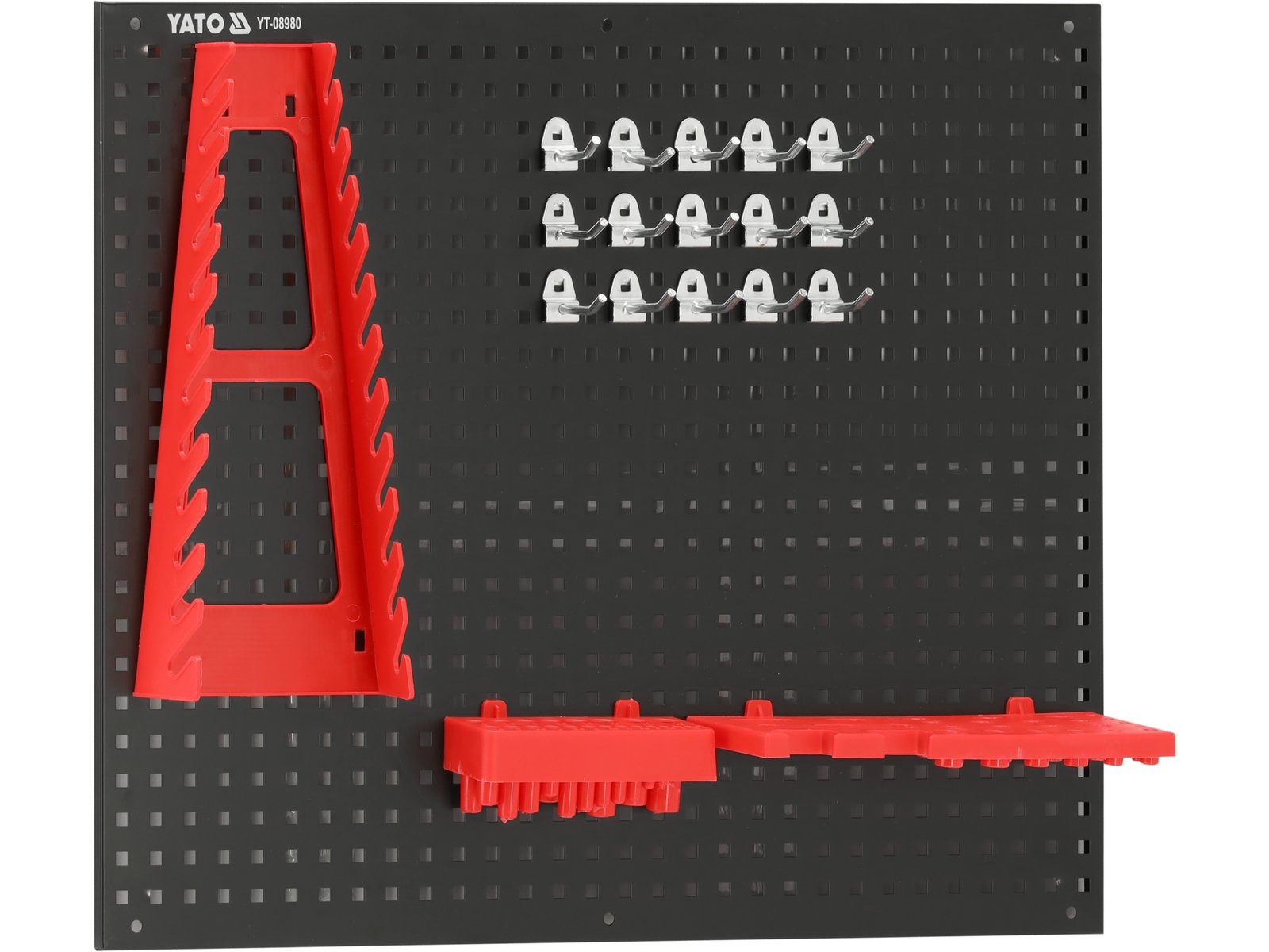 - Setați conținutul: placă perforată x2|recipient din plastic x4|cârlig scurt x15|cârlig lung x5|cârlig dublu x2|cârlig clește x3|suport cheie|suport pentru șurubelniță|suport pentru burghiu