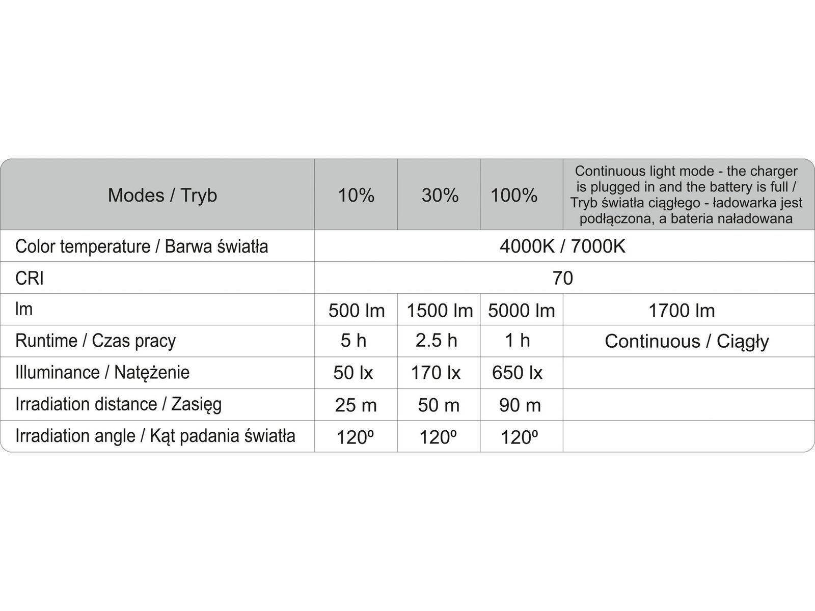 - Indicele de redare a culorii CRI Ra: 70
