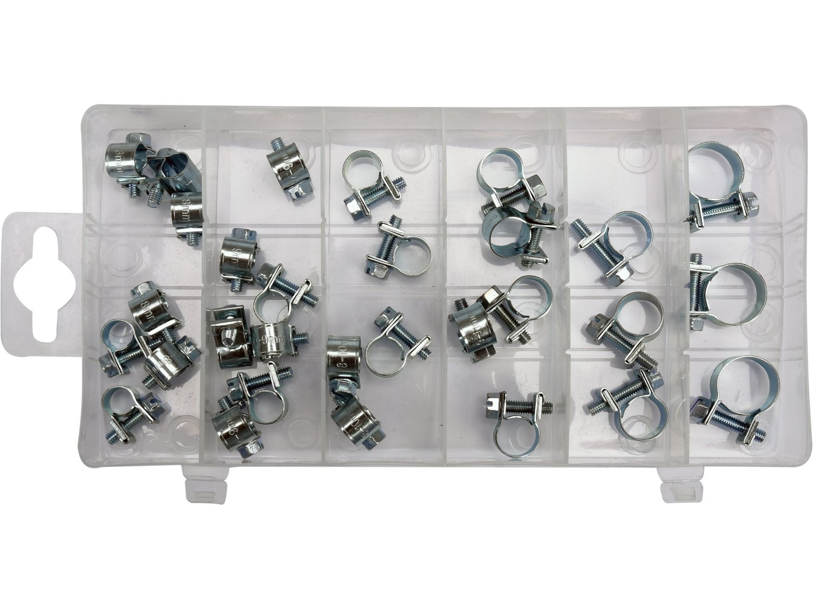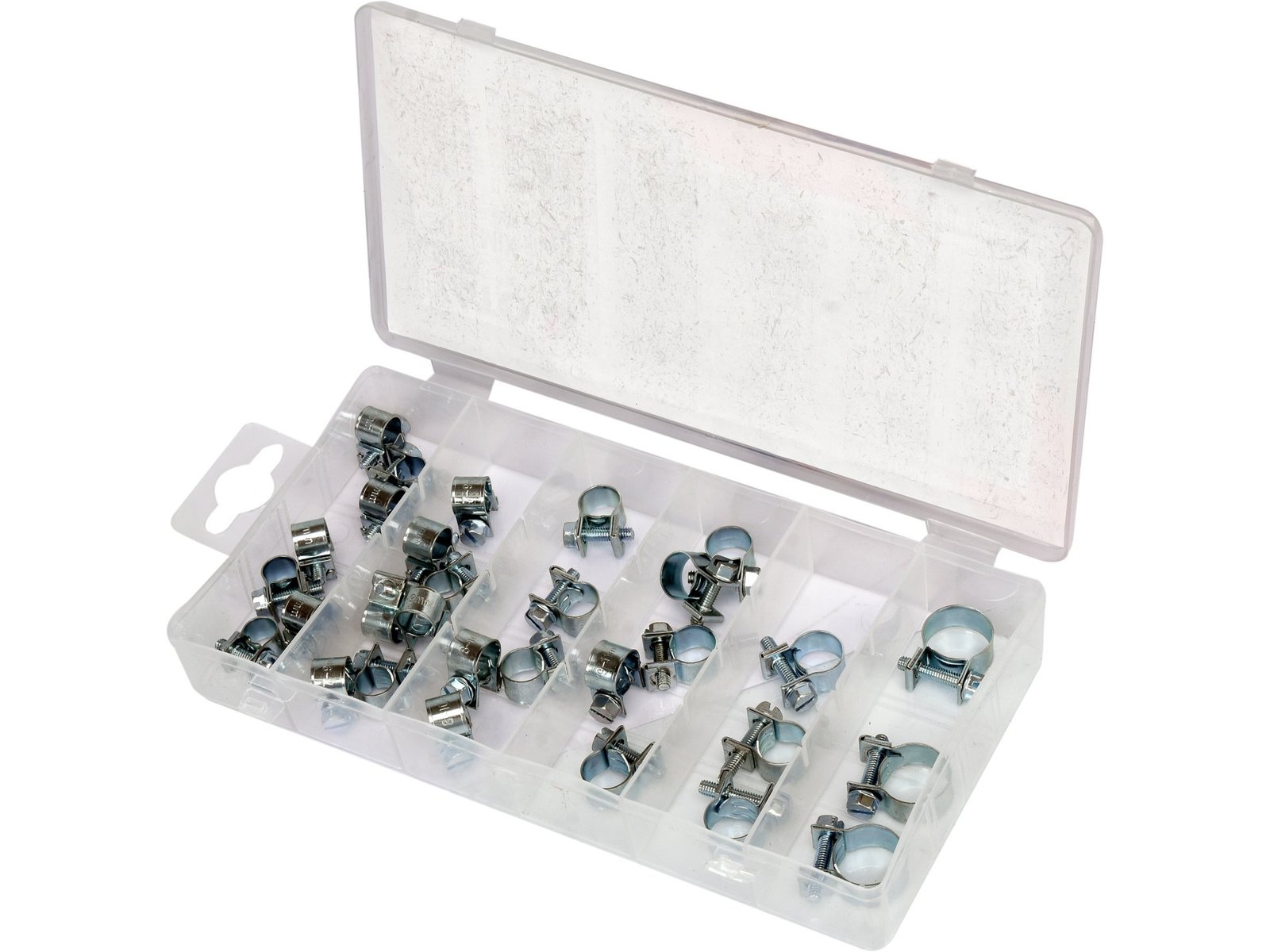 • Setați conținutul: cleme x30 (Ø6-8 mm x7, Ø7-9 mm x7, Ø8-10 mm x5, Ø9-11 mm x5, Ø10-12 mm x3, Ø14-16 mm x3)