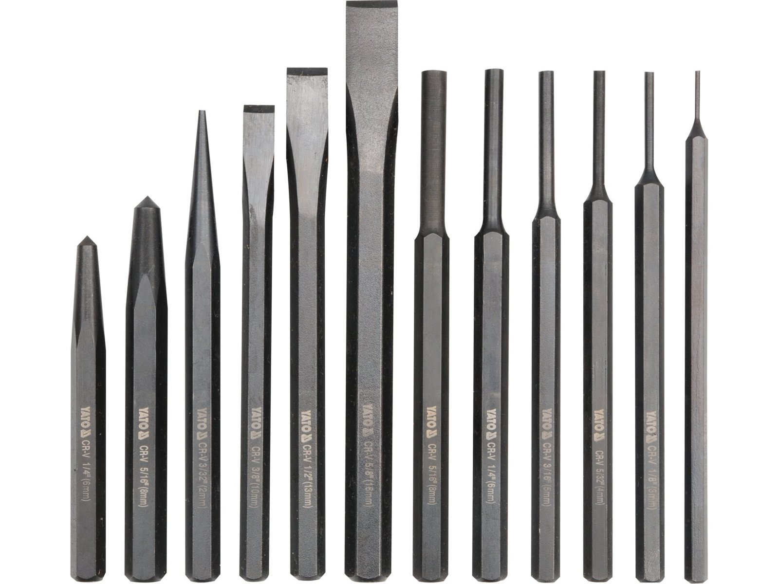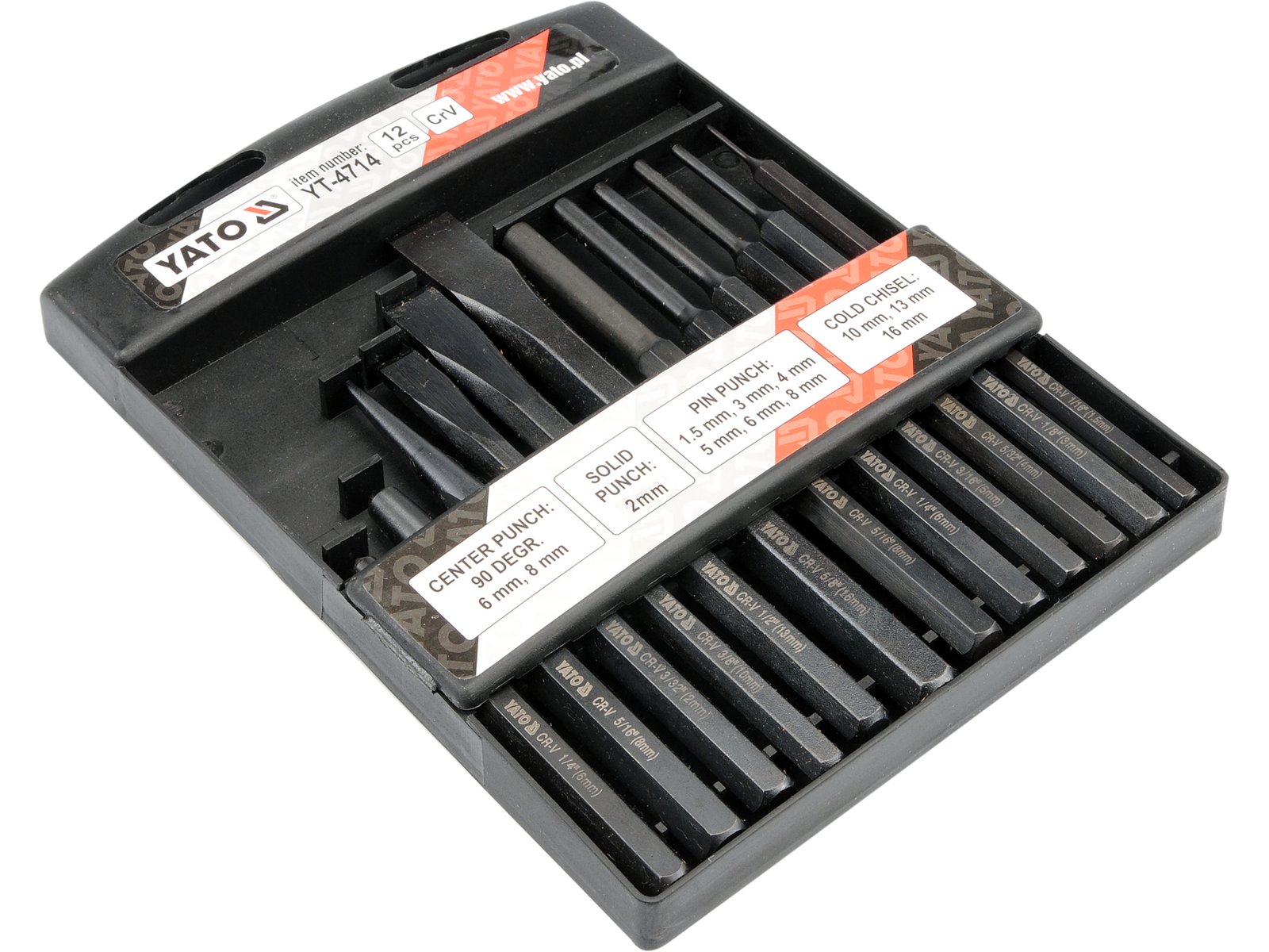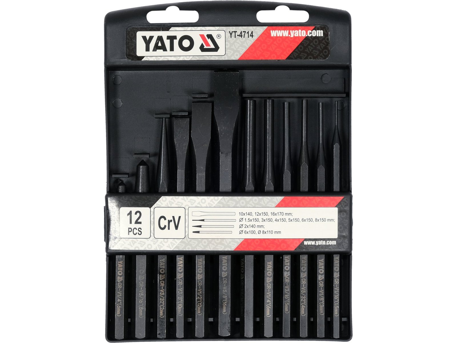 • Setați conținutul: tăietor plat x3 (10×142 mm, 12×152 mm, 16×172 mm)|poanson paralel x6 (Ø1,5×152 mm, Ø3×152 mm, Ø4×152 mm, Ø5×152 mm, Ø6×152 mm, Ø8×152 mm)|bloc de filetare conic (Ø2×140 mm)|
