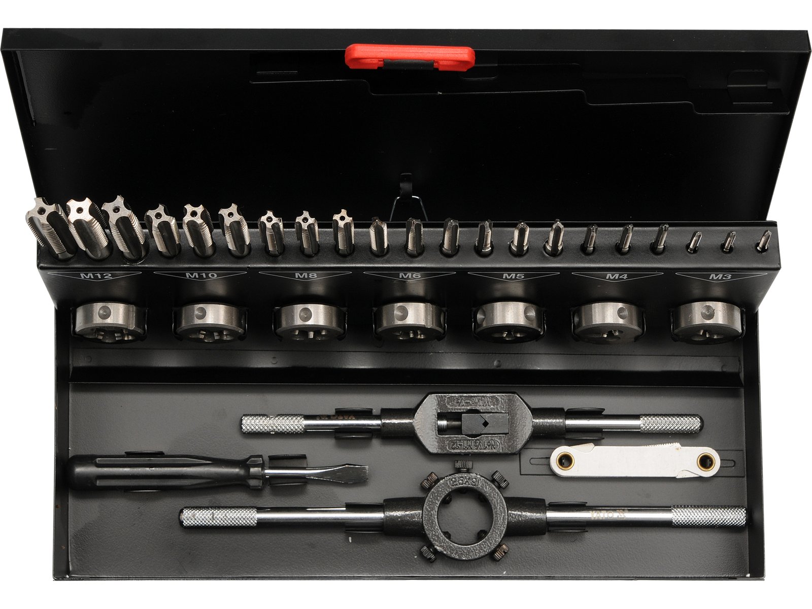 - Conținutul setului cont.: matriță x7 (M3x0,5 mm, M4x0,7 mm, M5x0,8 mm, M8x1,25 mm, M10x1,5 mm, M12x1,75 mm)|suport matriță (M7-M9)|robinet butonul (M1-M12)|